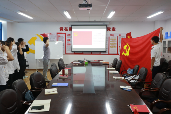 全体党员首先进行了党史学习,观看视频短片《百年誓言》,回顾入党誓词的变迁,交流观看体会,不忘初心誓言。随后,两个结对支部在红色的党旗下,重温入党誓词,铭记使命担当。